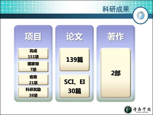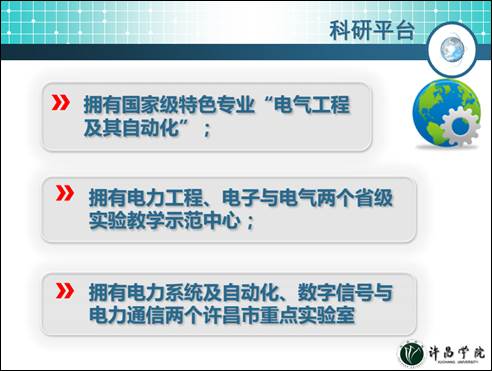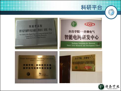 研究平台坚实,学术交流活跃:拥有电力通信数字信号处理省级工程技术研究中心、智能电网协同创新中心、智能电网研发中心等研究机构;拥有动力电机自动化装备产学研合作基地;拥有国家级特色专业“电气工程及其自动化”;拥有电力工程、电子与电气两个省级实验教学示范中心;拥有电力系统及自动化、数字信号与电力通信两个许昌市重点实验室,拥有电力电子、新能源等实验室;主办国内学术研讨会2次,邀请国、内外学者讲学9人次,参加国际学术会议2人次,参加国内学术会议69人次。