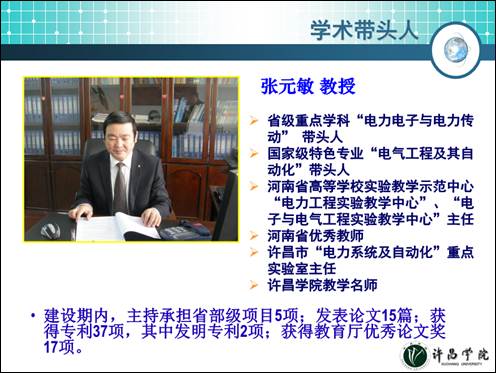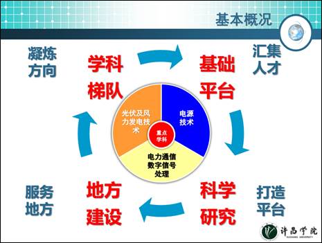 许昌学院电力电子与电力传动省级重点学科于2012年10月批准立项,学科遵循“凝炼方向、汇集人才、打造平台、服务地方”的建设思路,形成了光伏及风力发电技术、电源技术、电力通信数字信号处理三个研究方向。在学科梯队建设、基础平台建设、科学研究及服务地方等方面取得了显著成绩。