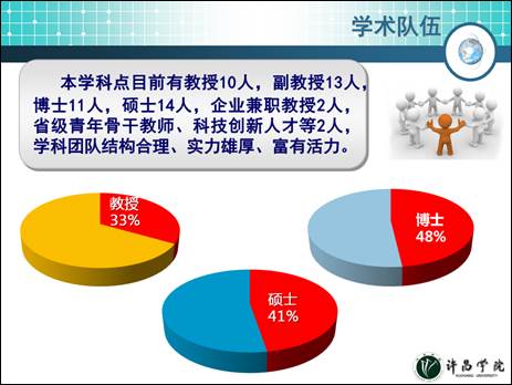 本学科点现有教授10人,副教授11人,博士11人,硕士14人,企业兼职教授2人,省级青年骨干教师、科技创新人才等2人,学科团队结构合理、实力雄厚、富有活力,团队成员在各自的领域都有独到的研究成果,形成有效的优势互补。